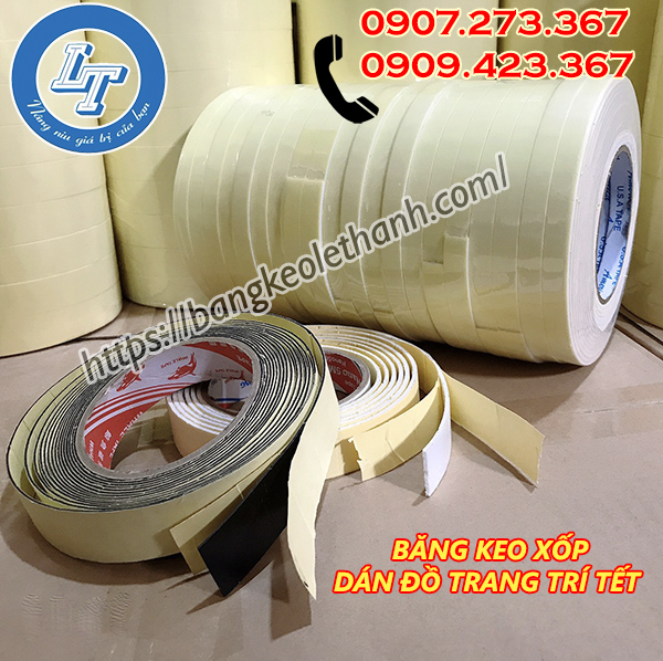 Băng keo xốp 2 mặt chuyên dán đồ trang trí Tết, ngoài ra băng keo xốp còn được sử dụng để dán các hộp quà tết với nhau